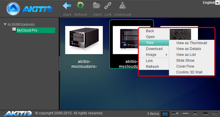 | Open | Open the selected item. For albums, this opens the album. For images, this opens the image in the image viewer. For other media files, this opens the file in the media player. |