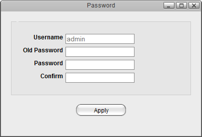 To change the password of the currently logged in user, enter the old password, enter the new password twice and then click Apply to save the changes.