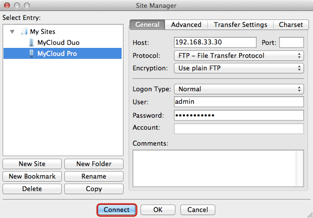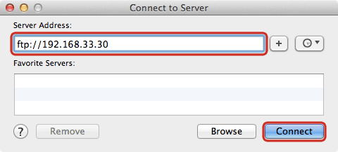 - Type ftp:// followed by the local IP address (e.g. 192.168.1.10) of your network drive and click Connect.