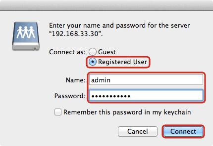 - Select Registered User, enter the login credentials of your user account on the network drive (e.g. admin/admin) and click Connect.