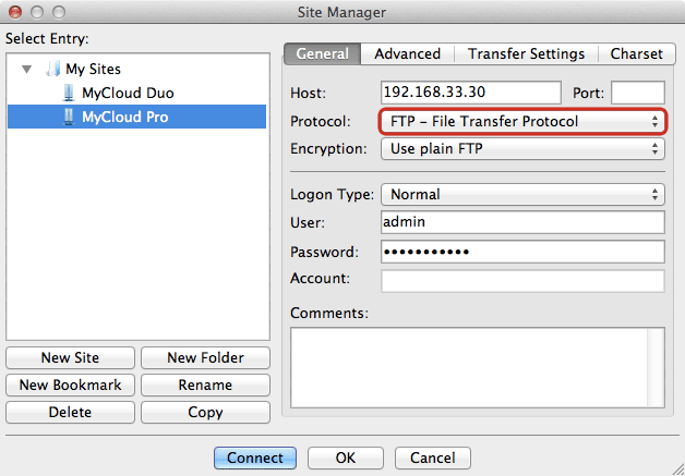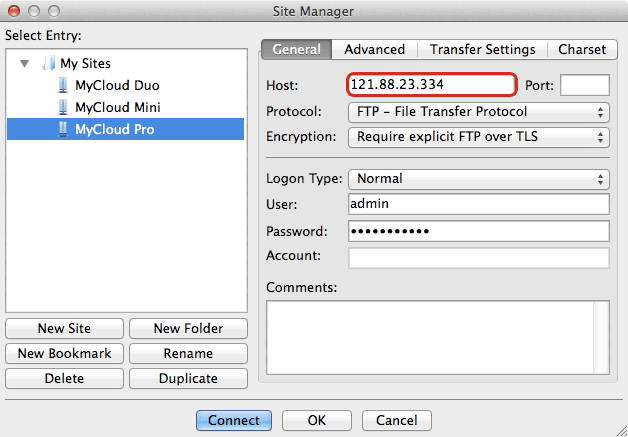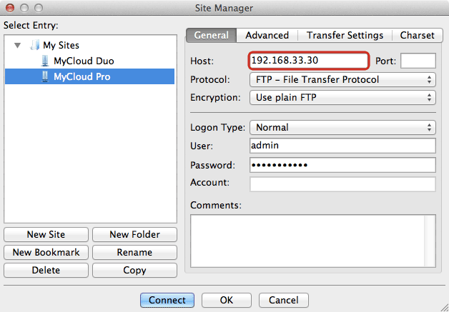 - For the host, enter the IP address of your network drive (e.g. 192.168.33.30). Use the local IP address as seen under Preferences > Server Info but without the port number.