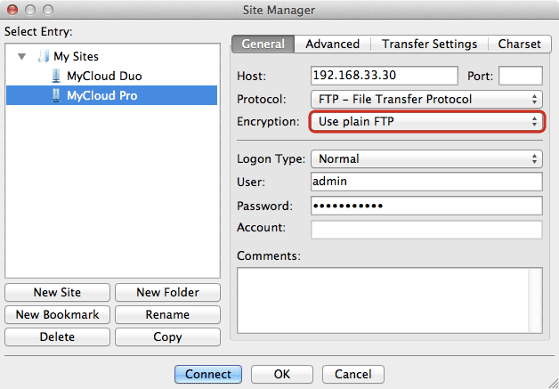 - For the encryption, select Use plain FTP. If the FTP server is set to use SSL encryption, select Require explicit FTP over TLS instead.