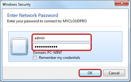 - When prompted for the login credentials, enter the username and password of your user account on the network drive and click OK. As an example, the administrator would enter admin for both username and password.