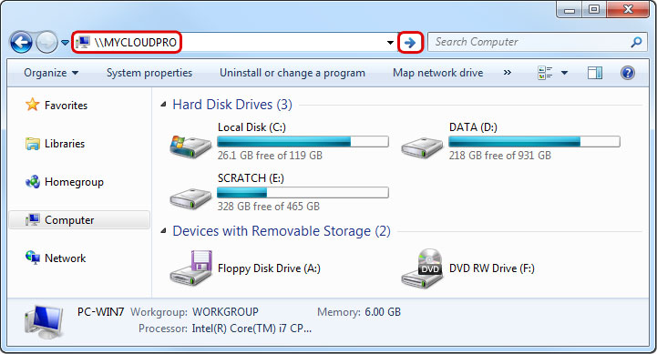 - Enter two backslashes followed by either the host name (e.g. \\MYCLOUDPRO) or the IP address (e.g. \\192.168.1.30) of your network drive into the address field and then click Enter on your keyboard or click on the Go to arrow in the file explorer.