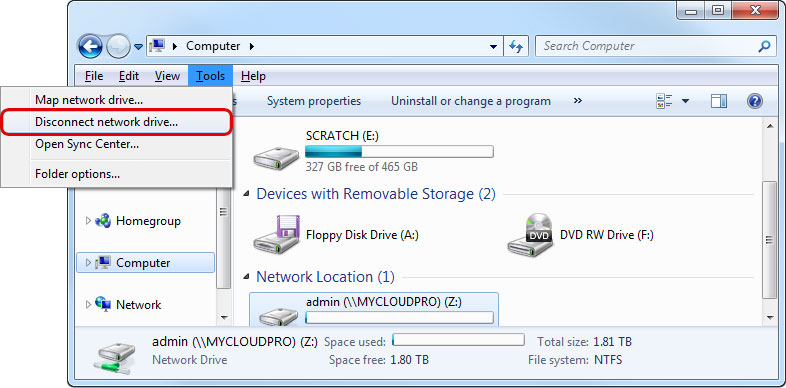 - Go to the menu bar and select Tools > Disconnect network drive….