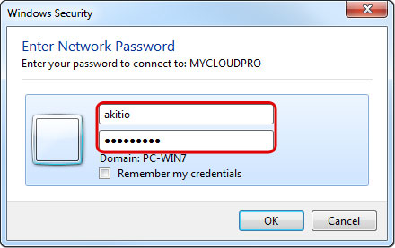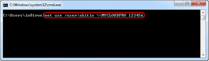 - Still using the command prompt, type net use /user:username \\server\sharename password to create a new connection. In this example, the correct command is net use /user:akitio \\MYCLOUDPRO 123456. You could also connect to a share like this net use /user:akitio \\MYCLOUDPRO\akitio 123456