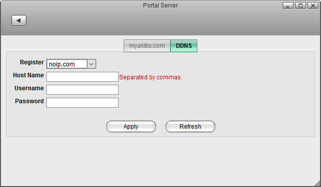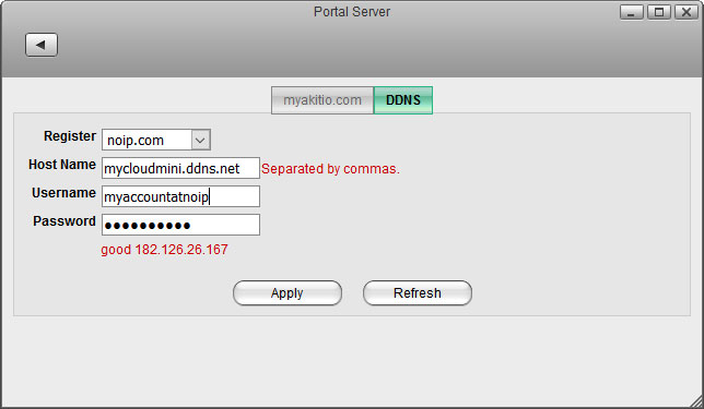 5. Enter the hostname you have just registered at noip.com as well as the username and password of your account at noip.com, then click Apply to save the settings. If the information is valid, you will see a message displaying good along with your current external IP address.