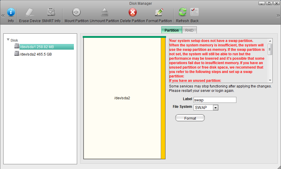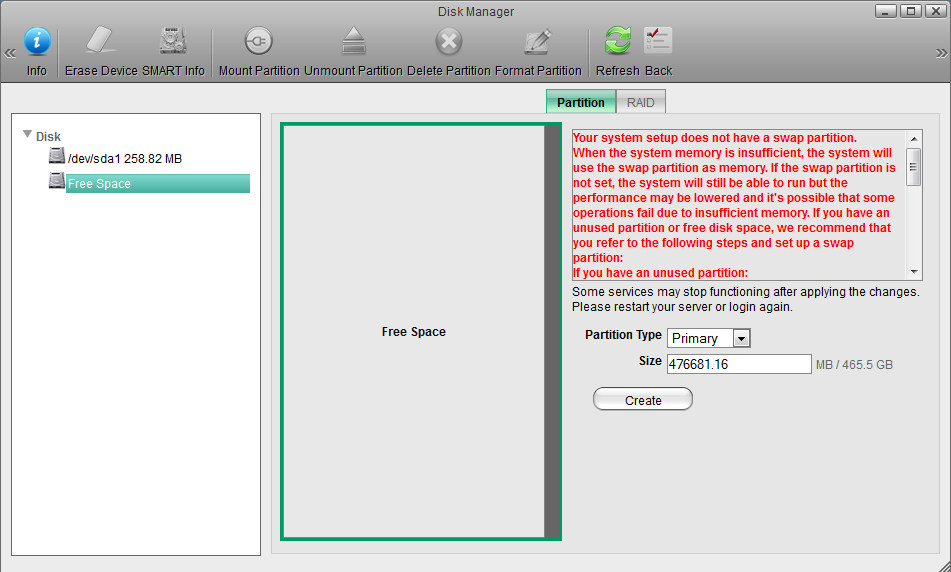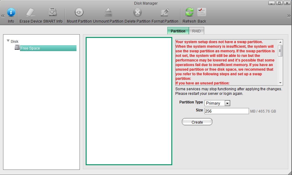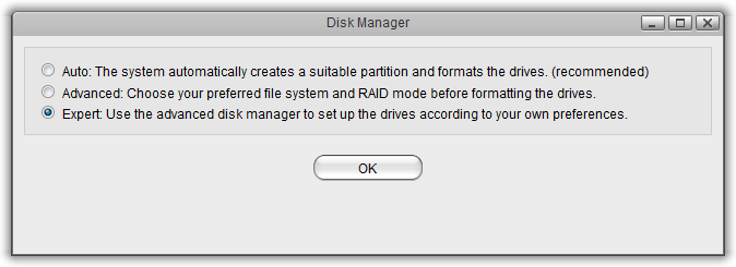 The following instructions are for blank drives without any existing partition(s) or data on it. If your drive has an existing partition and some data on it already, backup your data to a different location first! Once the backup is completed, connect the drive to your NAS and in the disk manager, click Unmount Partition, followed by Delete Partition. This step erases all existing data on that drive. Your drive is now ready for setup as system drive.