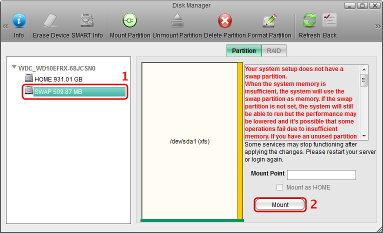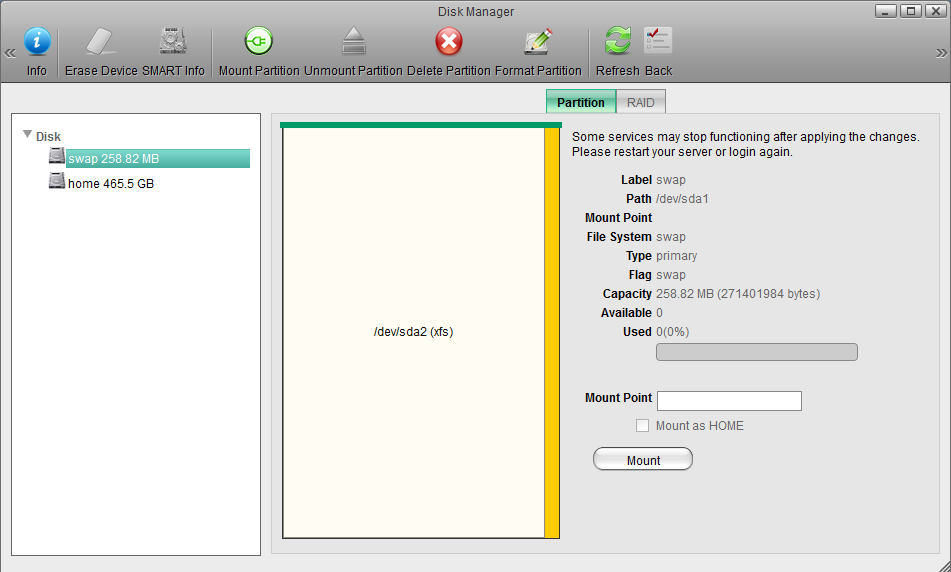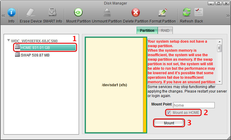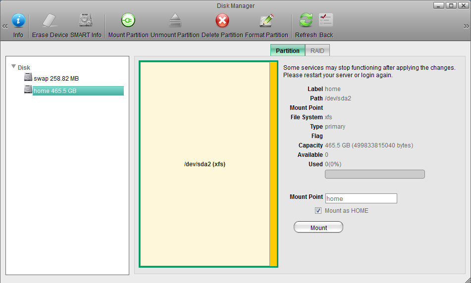 Under some circumstances (e.g. after a reset, after receiving a replacement product), you might have an existing HOME and SWAP partition that contains all your data but you are not able to access it, because the partitions are no longer mounted. If that happens, a pop-up window will appear upon login and inform you that the system is currently running without a HOME partition. All you need to do is simply mount the existing partitions again.