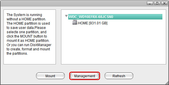 2. A window opens automatically with a message saying that the system is running without a HOME partition. Select Management to open the disk manager.