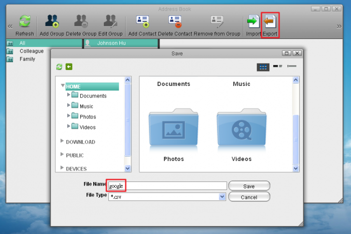 - Open the Address Book in iSharing, click Export to save your Address Book (. Csv files), file name can be customized.