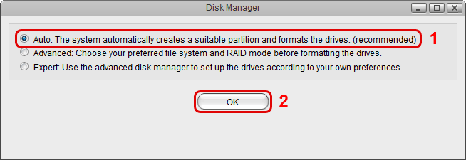 3. Select Auto and click OK. This will automatically create the necessary partitions and format the drive(s).