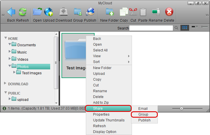 If your friends do not have a user account, you can still share your files by selecting either Email or Publish instead of Group. This will create a public link, that you can then send to your friends. Clicking on it will open the album and display the files you have shared.