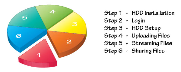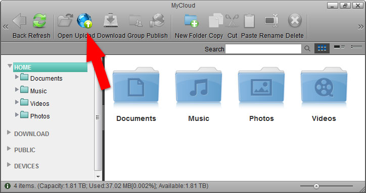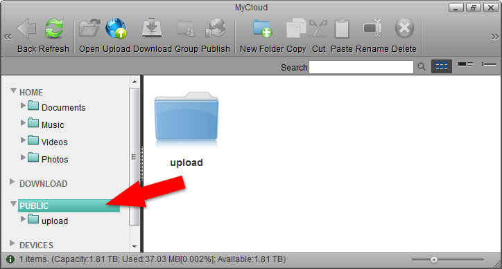 Once the system drive has been setup, you can start uploading your digital media files to the network drive. The HOME directory with its predefined folders for documents, music, photos and videos is for your private files. The PUBLIC directory is for files that are shared among the users that have access to this device (by default, this is only the administrator).