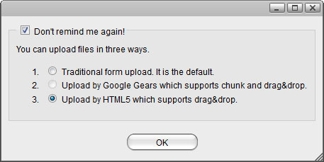 4. Select one of the available upload methods. If in doubt, select the traditional form upload. This will work on most browsers but you will have to upload the files one at the time. Instead, if you are running one of the more recent browsers, select Upload by HTML5, which allows you to drag and drop multiple files directly into the upload window.