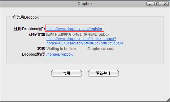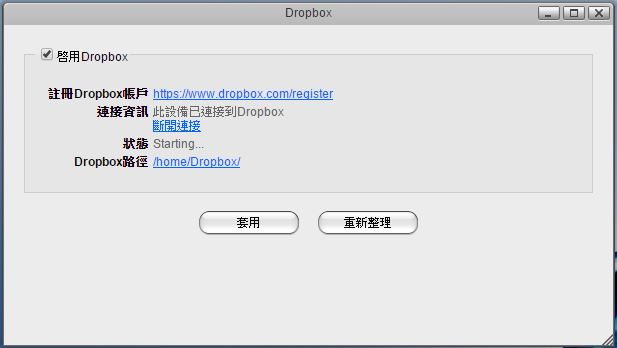 | Dropbox 路徑 | 預設存放位置為 /home/Dropbox/,點擊連結可開啟資料夾。 |