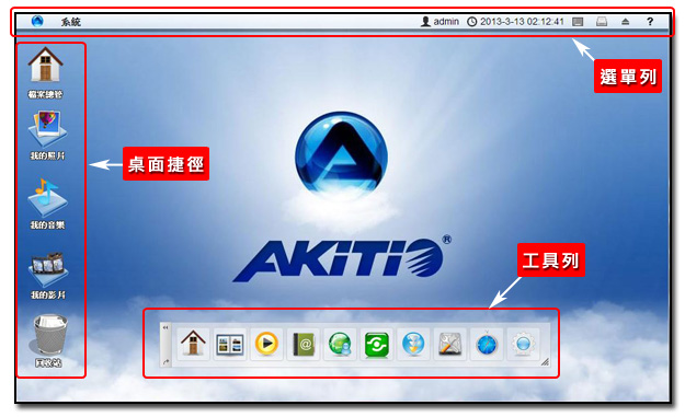 私有雲雲端系統桌面就像一個作業系統的桌面,你可以在這裡管理或瀏覽你的檔案,並且完成各項系統設置。 最上方是選單列,桌面上有工具列和捷徑,桌面的工具列與捷徑內容可自由變換。