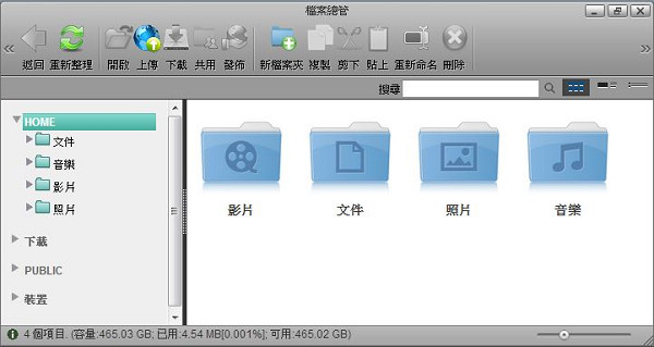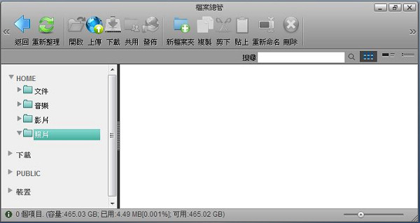 預設捷徑目錄包含「我的照片」、「我的音樂」、「我的影片」,點選後會直接開啟私有雲中相對應的資料夾。