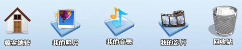 預設桌面捷徑有「檔案總管」、「我的照片」、「我的音樂」、「我的影片」、「回收站」等 5 個項目。