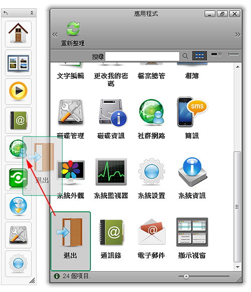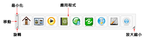 工具列可以快速的使用應用程式與系統設置。您可以自由的添加或刪除工具列內容,變更的方式可以直接拖曳,或是點選滑鼠右鍵。