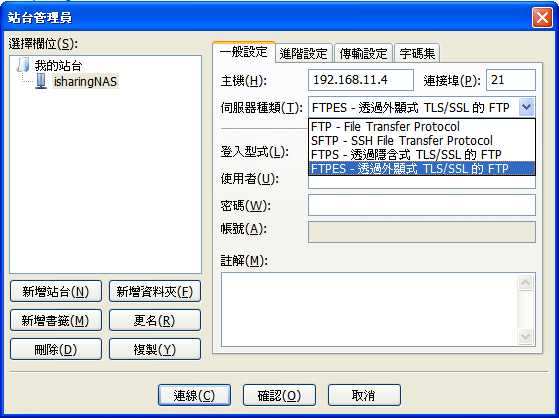 - 設定伺服器種類為FTPES(透過外顯式的FTP)。