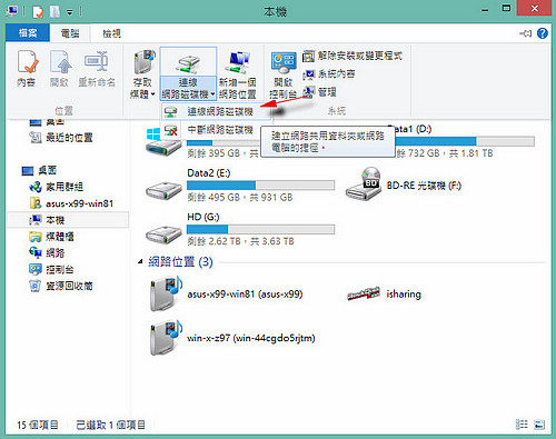- 打開我的電腦(檔案總管),在上方工具列中,選擇「連線網路磁碟機」。<