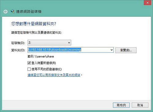 - 在「資料夾(O)」欄位中輸入「\\IP位址\資料夾」,然後按「完成」。<