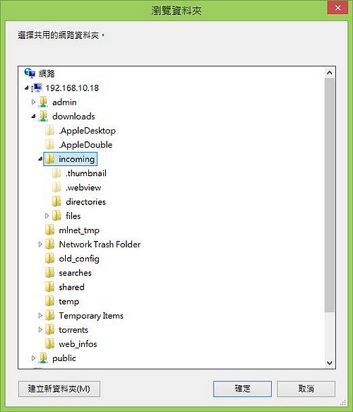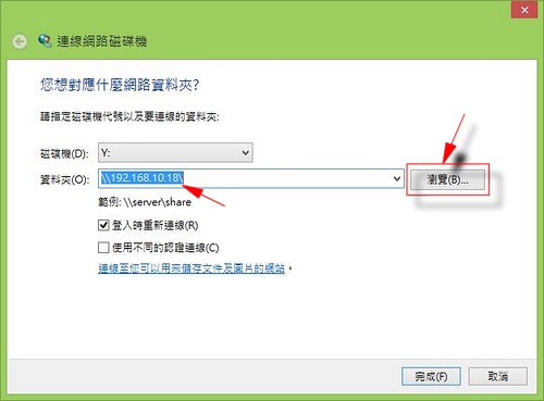 - 您也可以直接輸入IP位置後,點選「瀏覽」選擇您要連線的資料夾。<