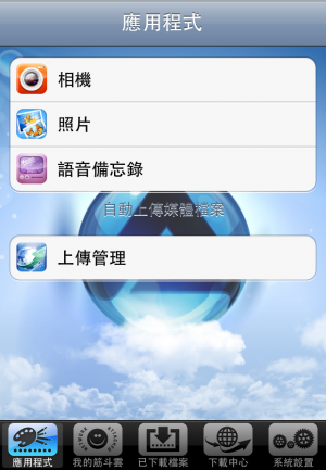登入成功後,即可進入系統主畫面,下方有五個主要的頁籤:應用程式、我的私有雲、下載中心、系統設置。