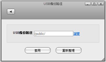 當您的 USB 外接盒連接到有提供 USB 備份按鍵的私有雲時,當連接的指示號亮起,按下「備份按鍵」時,將進行資料的備份動作,USB 外接盒內的所有資料將備份到您所指定的路徑下。