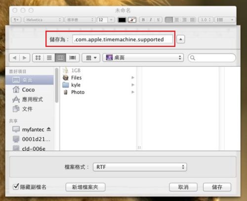 - 利用「文字編輯器」等程式建立一個空檔案並另存為「.com.apple.timemachine.supported」。