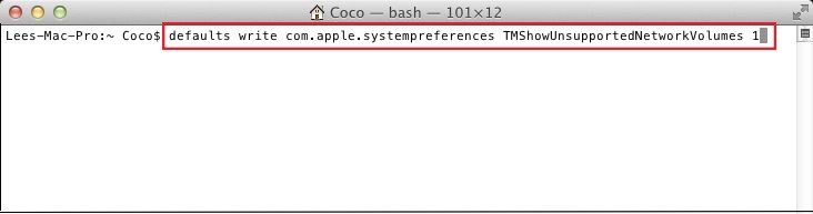 - 輸入「defaults write com.apple.systempreferences TMShowUnsupportedNetworkVolumes 1」,然後按鍵盤的Return。